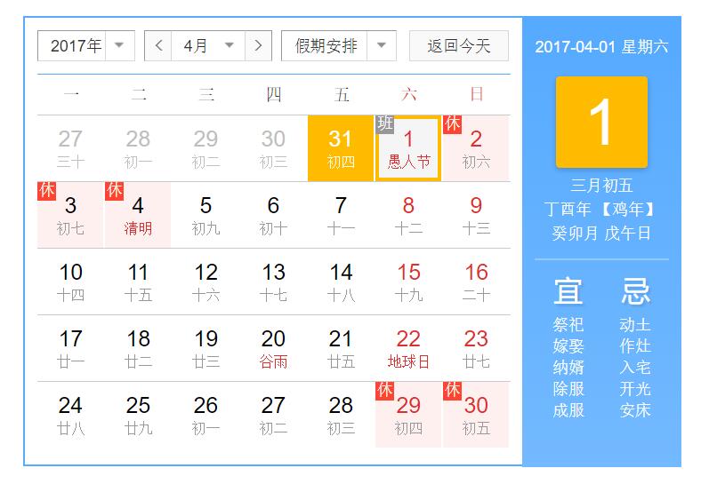 一、2017年清明节假期共3天,从2017年4月2日至2017年4月4日。其中,2017年4月5日(星期三)开始正常上班。